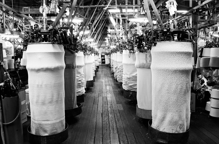 吊り編み機は1時間に1m程度、糸が常に空気を含みながらリラックスした状態で編み上げ、編み上がり生地も強制的に巻き取らないため、上質で柔らかく仕上がります。